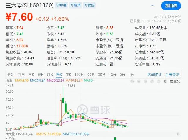 截至 8 月 2 日收盘,360股价报告 7.6 元,最新市值达到 543 周鸿祎持有的股票市值达到亿元 72 亿元。