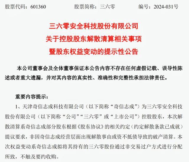 8 月 2 日晚间,360 公司发布公告称,公司控股股东奇信志成科技有限公司(以下简称奇信志成)解散清算。其持有的 360 公司 46.14% 股份将通过非交易转让方式分配给股东。