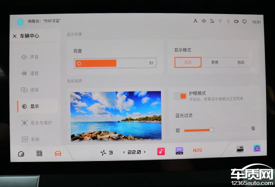 值得注意的是,这一块 14.6 英寸中控屏显示效果清晰细致。打开画质增强选项后,整体表现会更好。此外,屏幕不仅可以调节亮度和冷暖色温,还可以支持护眼模式,调节蓝光过滤的强度。