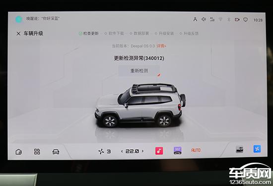 2024 款深蓝 G318 搭载 Deepal OS 车辆系统,开门车辆通电后,系统将首先进行一个简短的开机动画,然后进入主页。实际上,整个启动速度还是很快的,基本上不需要等待。或许是由于试装车的原因,评估汽车汽车系统的版本显示为 而且在常规连接中,0.0 4G 在网络的前提下,仍然存在更新检验异常的问题。从推断来看,这个大概率是试装车的个体 Bug,幸运的是,它对后续的测试工作没有太大的影响。据深蓝汽车官网显示,Deepal OS 现在推送已经开始了 2.2 虽然版本,但暂时只针对深蓝色 S7 以及深蓝 SL03 两款车型。
