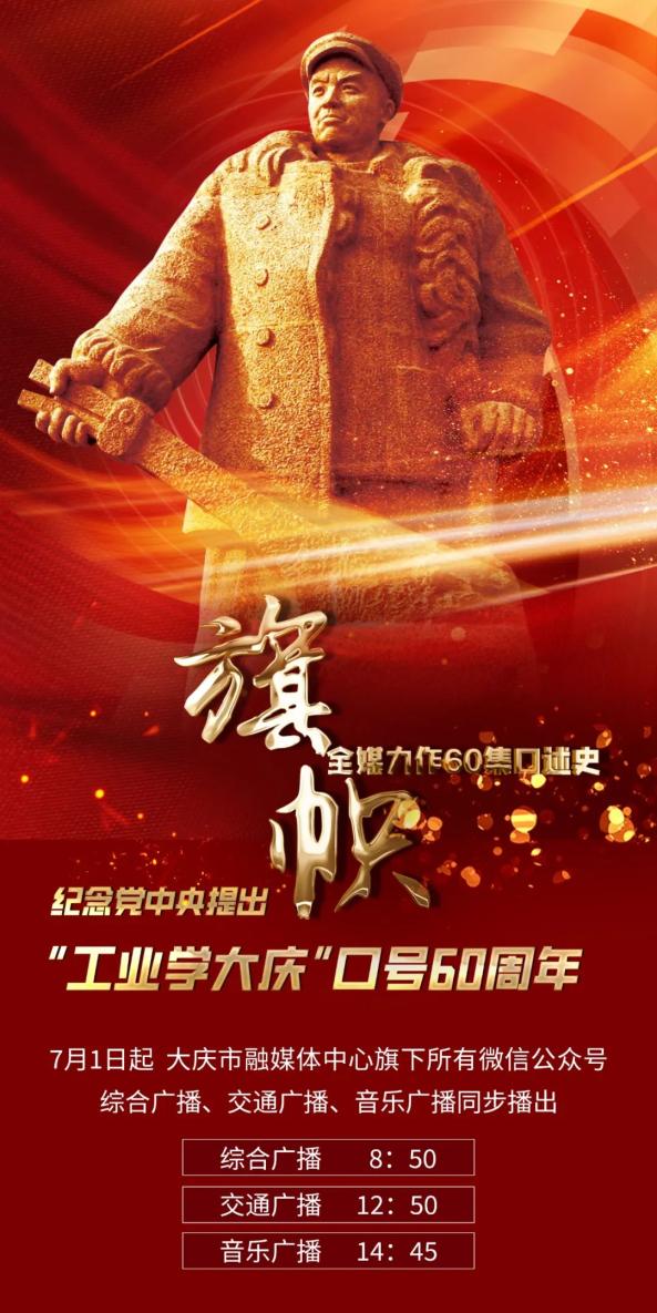大庆工业学,大庆永远向前。提出工业学大庆口号60周年纪念党中央,并向党的生日献礼。从大庆市媒体中心听说大庆工作室和大庆师范学院大庆精神研究基地,联合推出了60集口述史——旗帜。7月1日起,所有微信微信官方账号、综合广播、交通广播、音乐广播均在大庆市媒体中心同时播出。60位油田开发者将带你再次感受那段史诗般的光辉岁月,陪伴你回望历史,在声音中汲取力量。