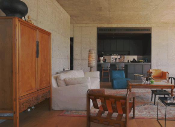 房子整体处于高档灰色状态,与乡村这样的青砖灰瓦相对应。建筑主体采用钢筋混凝土,从墙壁到顶部非常原始和裸露。