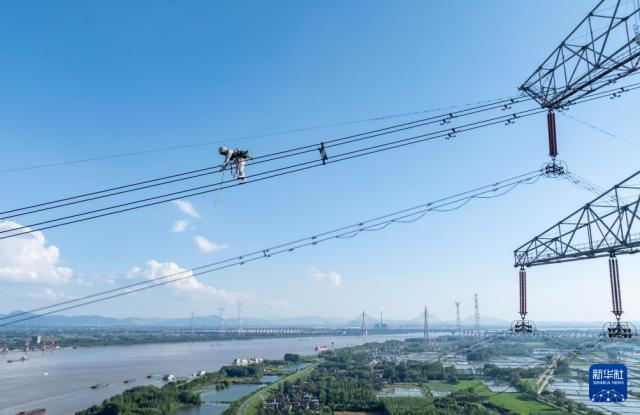 位于安徽芜湖无为市高沟镇 500 KV肥繁 5305 线路长江大跨北塔,安徽送变电工程有限公司维修人员对线路进行带电维修(无人机照片)。
