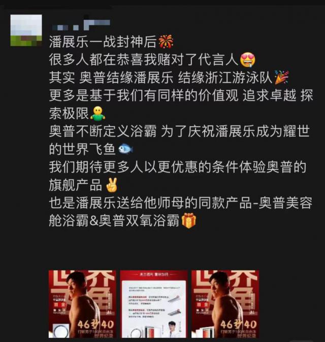获得潘展乐冠军后,奥普科技 CEO 吴兴杰在朋友圈里掩饰不住自己的兴奋。“大家都在恭喜我赌对了代言人”。但是没有那么多意外,更多的是相同价值观的相互欣赏。