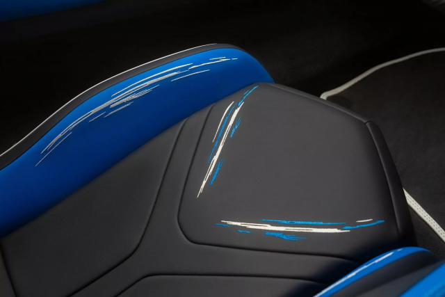 椅子也装饰着与外部颜色相同的蓝色。后挡板上还安装了一块 Blu Mira 碳纤维板,并且安装了独特的启动装置。 / 停止按钮。