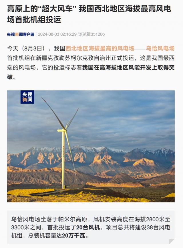 IT 世家 8 月 3 日消息,IT 今天(33),世家从央视新闻了解到 日),我国西北地区风电场海拔最高。 —— 在新疆克孜勒苏柯尔克孜自治州,乌恰风电场首批机组正式投运,标志着我国在新疆。高海拔地区风能开发上面有突破。