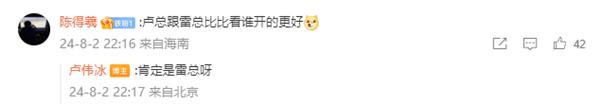 有网友对卢伟冰和雷军的驾驶技术感到好奇,卢伟冰幽默地回应:“一定是雷总呀”。