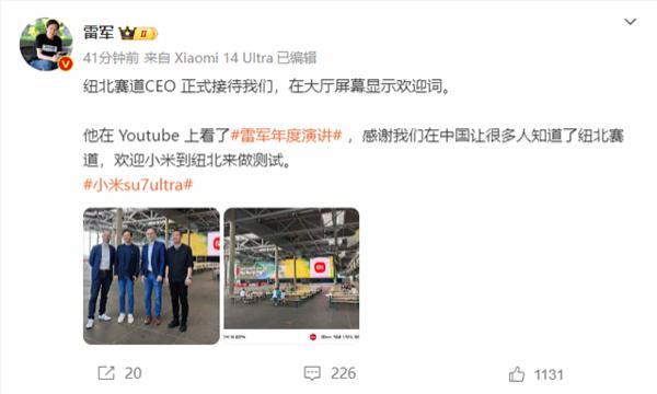纽北赛道 CEO 在 Youtube 看到雷军年度演讲,感谢小米在中国让许多人了解纽北赛道,欢迎小米到纽北进行测试。