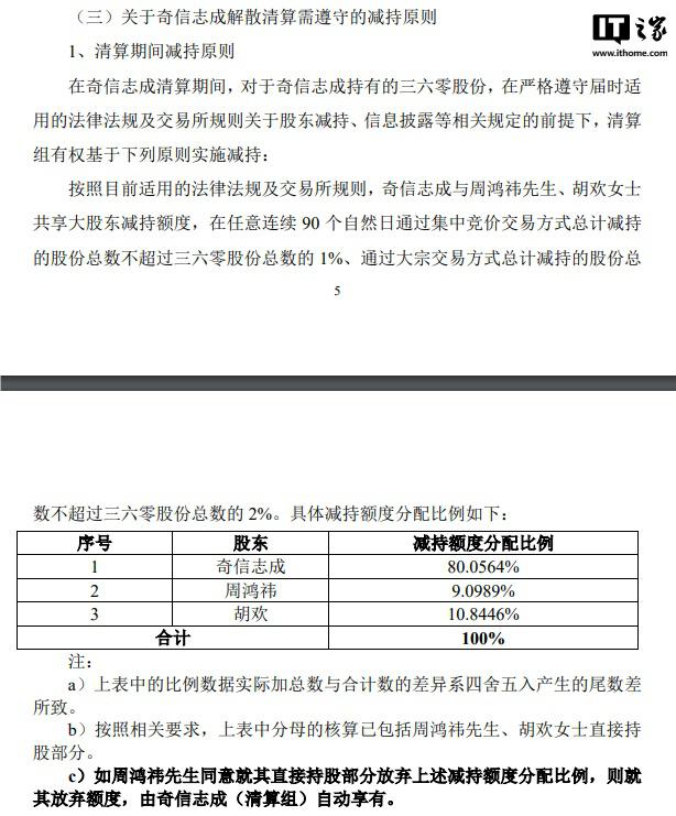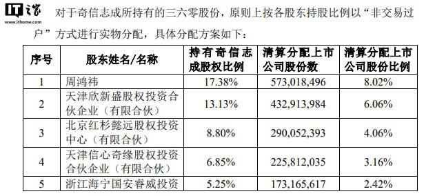 据 IT 众所周知,随着东奇信志成科技有限公司解散清算,其持有的360 46.14% 股份将通过非交易转让方式分配给各大股东。所以,周鸿祎的直接持股比例由 5.24% 增至 成为公司最大股东的13.26%。此外,天津新盛股权投资合伙企业(有限合伙)直接持股比例由 0 上升至 6.06%。