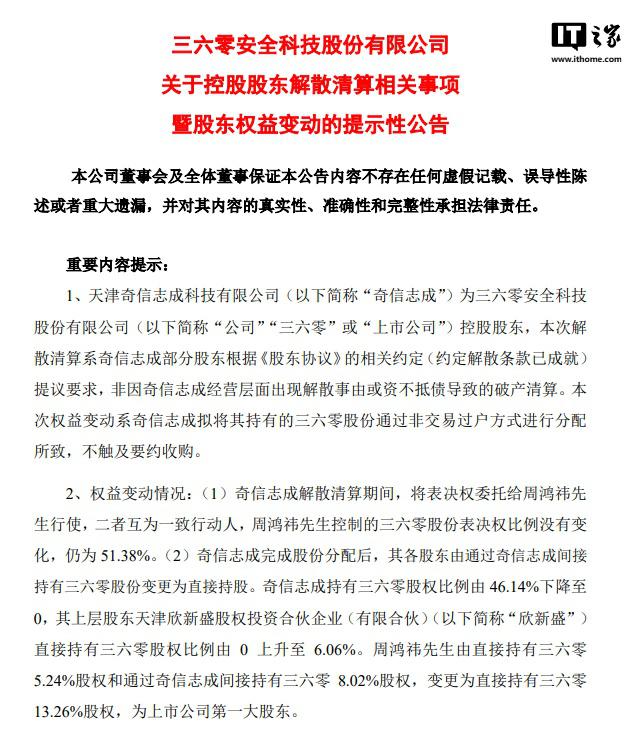 IT 世家 8 月 2 日消息,360发布公告,控股股东天津奇信志成决定结算。结算后,360的最大股东将从奇信志成转变为周鸿祎。在奇信志成解散清算期间,周鸿祎先生承诺 12 个月内不减持三六零股权。