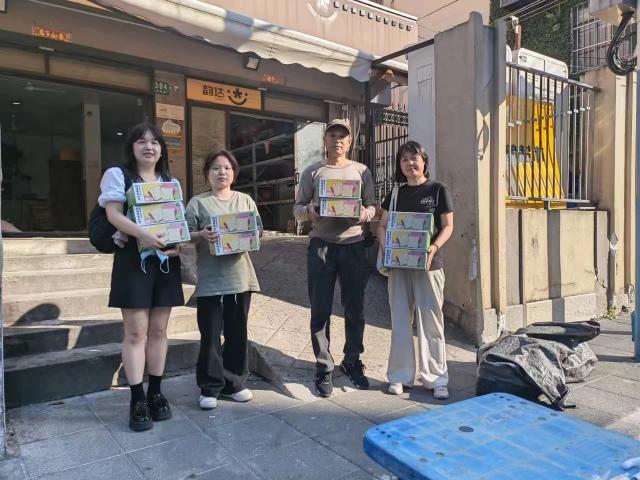 公司广场楼务会对临街商户党支部进行慰问,并向辛勤工作的“天目小哥”-快递站工作人员送上爱心面包。