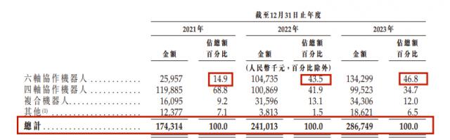 2021 年 -2023 2008年,越疆科技各自的收入。 1.74 亿元、2.41 亿元、2.87 亿元。根据产品类别,越疆科技的收入来自六轴合作机器人、四轴合作机器人、复合机器人和项目的解决方案(如 STEAM 教学实验室)及配套服务费(包括技术服务费、培训费和与合作机器人相关的维修费用)。