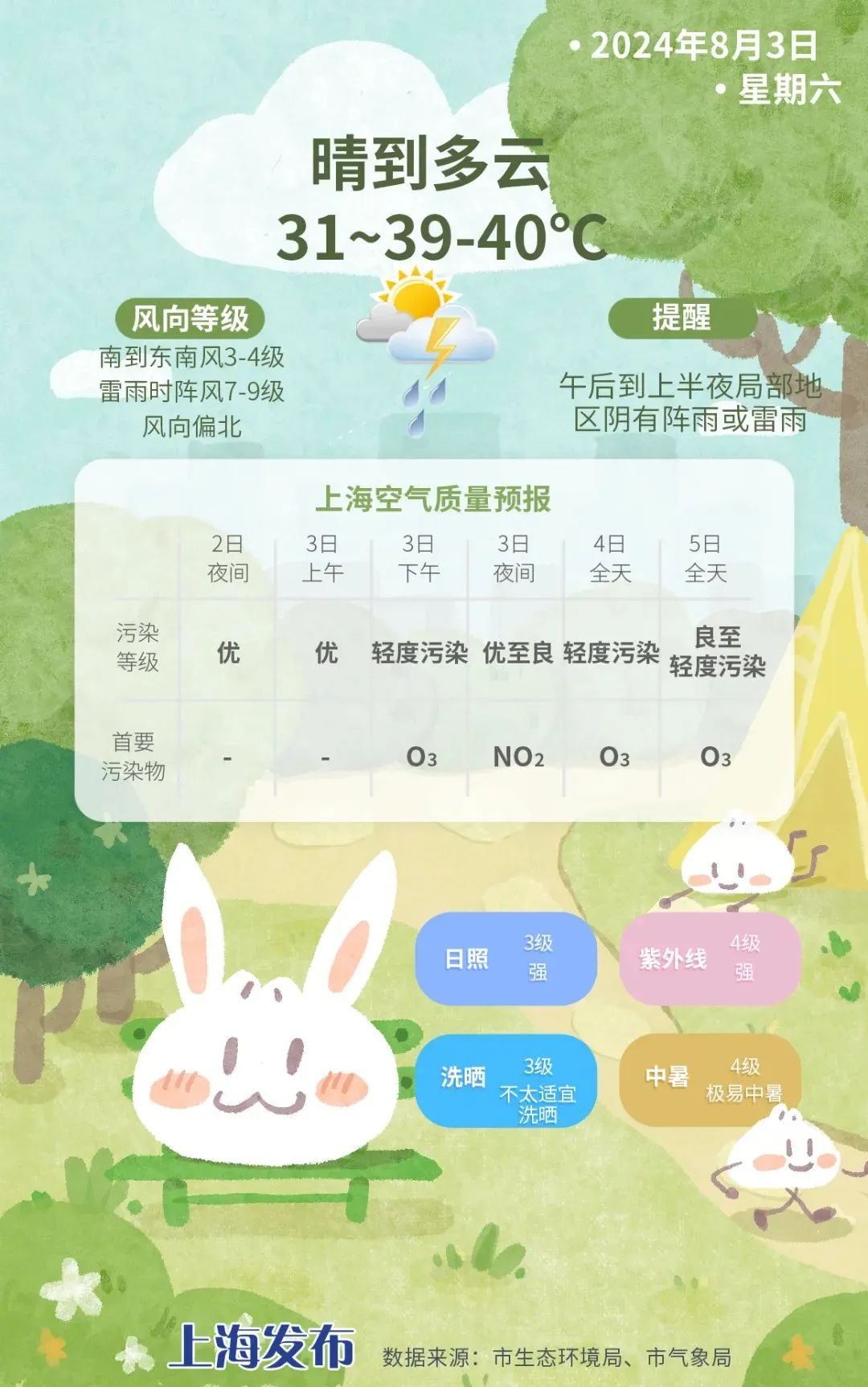 晴朗多云,下午至半夜部分地区阴雨或雷雨,最低气温31℃,最高气温39~40℃。南至东南风3~4级,雷雨时阵风7~9级,风向北,相对湿度80%~40%。