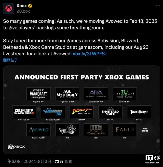 但是今天微软宣布这个“宣誓”将推迟到明年。 2 月 18 日常销售,这并不是因为游戏遇到了开发问题,而是因为“ 2024 年度大作汇集",微软希望调整游戏发行档期,从而为玩家的游戏日程提供“一些喘息空间”。