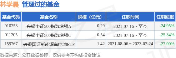 林学晨先生:CFA,研究生、硕士学位,中国国藉。曾经是湘财证券研究所的金融工程分析师。2015 年 6 每月加入兴银基金管理有限公司,曾担任兴银基金管理有限公司中央交易室衍生品交易员、衍生品业务部投资经理助理、投资经理、现任指数及量化投资部基金经理。2021 年 7 月 16 日本担任兴银中证 500 指数强化型证券基金经理。2021 年 8 月 6 日至 2023 年 2 月 24 开放式指数证券投资基金主管日任兴银国证新能源汽车电池交易。2024 年 3 月 5 日起担任兴银中证港股通科技交易型开放式指数证券投资基金的基金经理。目前任兴银中证科创业 50 指数型证券投资基金基金主管。2024 年 4 月 26 日本担任兴银中证 1000 指数强化型证券基金经理。