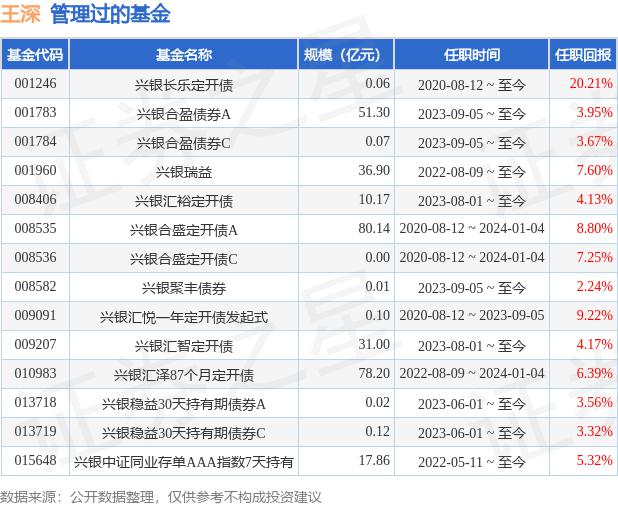 王深先生:中国国家,硕士学位,战略分析部副总经理 ( 主持工作 ) ,现任兴银基金管理有限公司投资决策委员会成员。2015 年 4 每月加入兴银基金管理有限公司担任信用研究员、基金经理助理,现任兴银基金固定收益部下设二级部门战略分析部副总经理。 ( 主持工作 ) ,也是基金经理。自 2020 年 8 月 12 日起任兴银长乐半年定期开放债券型证券投资基金经理。自 2020 年 8 月 12 日至 2023 年 9 月 5 每年定期开放债券型发起式证券投资基金主管的日任兴银汇悦。2020 年 8 月 12 日至 2024 年 1 月 4 三年来,日任兴银合盛定期开放债券型证券投资基金经理。2022 年 8 月 9 任兴银瑞益纯债券型证券投资基金基金主管日起。曾经是兴银汇泽 87 债券型证券投资基金基金经理每月定期开放。2023 年 6 月 1 任兴银稳益日起 30 天持期债券型证券投资基金基金经理。2023 年 8 月 1 作为兴银汇智一年定期开放债券型发起式证券基金,兴银汇裕一年定期开放债券型发起式证券投资基金主管。2023 年 9 月 5 日本担任兴银聚丰债券型证券投资基金基金主管。