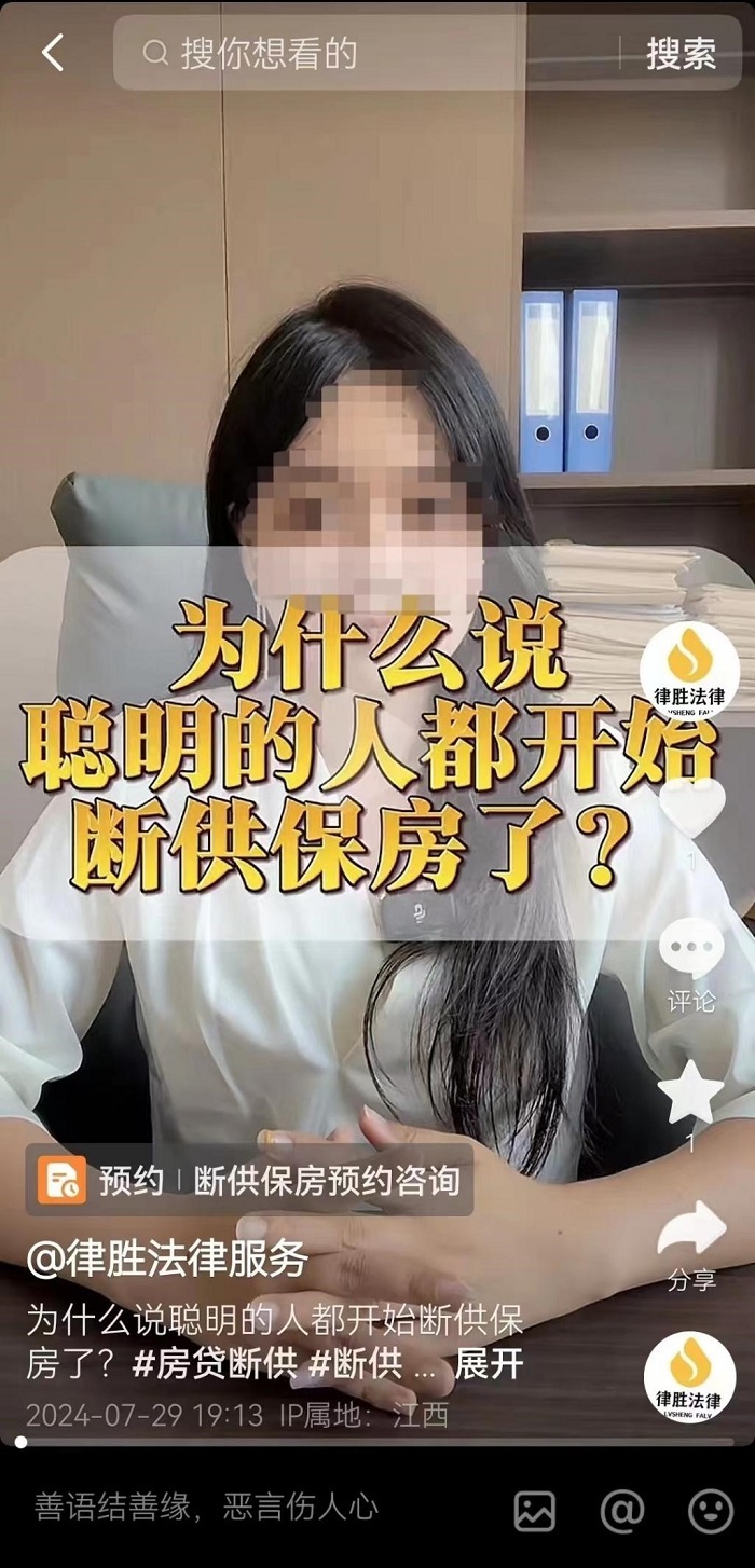 近日,江西律胜商务咨询有限公司官方账号“律胜法律援助”也发布了一系列关于“断供保房”业务的广告。