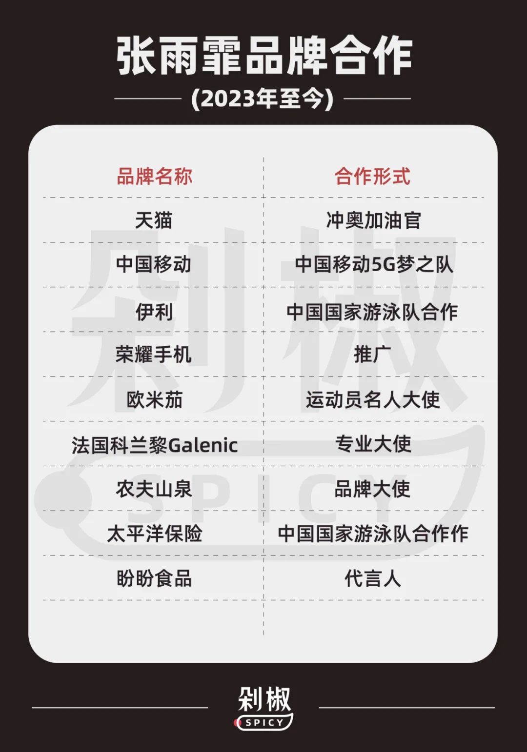 被誉为游泳队“蝶后”的张雨霏,也以自己的实力和美丽的外表赢得了法国科兰黎Galenic、荣耀手机等品牌的青睐。奥运会前夕,雅诗兰黛还发布了一则广告,与游泳队超级天才李冰洁。