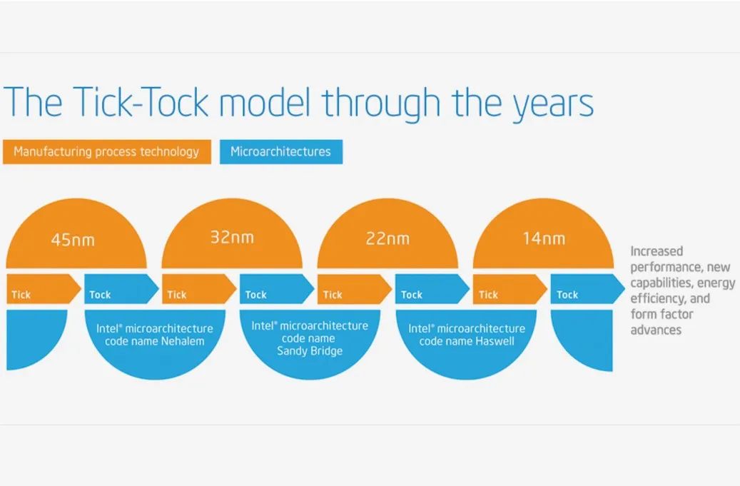 从2005年到2007年,英特尔再次推出了一种独特的Tick-Tock生产模式,即以两年为交替单位,“tick年”专注于芯片制造,更新芯片制造,改进工艺;“tock年”专注于ic设计,创新结构。