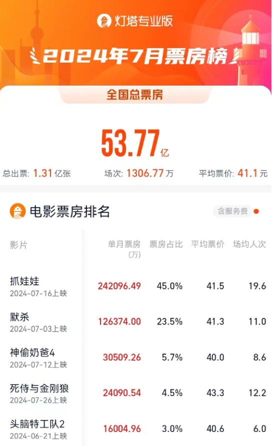 资料显示,2024年7月全国电影票房将达到53.77亿元,《抓娃娃》将达到24亿元。 一个独特的植物,《默杀》达到12亿 排名第二,《神偷奶爸4》、《死水与金刚狼》、《头脑特工2》三部进口电影在月票房中排名第三至第五。