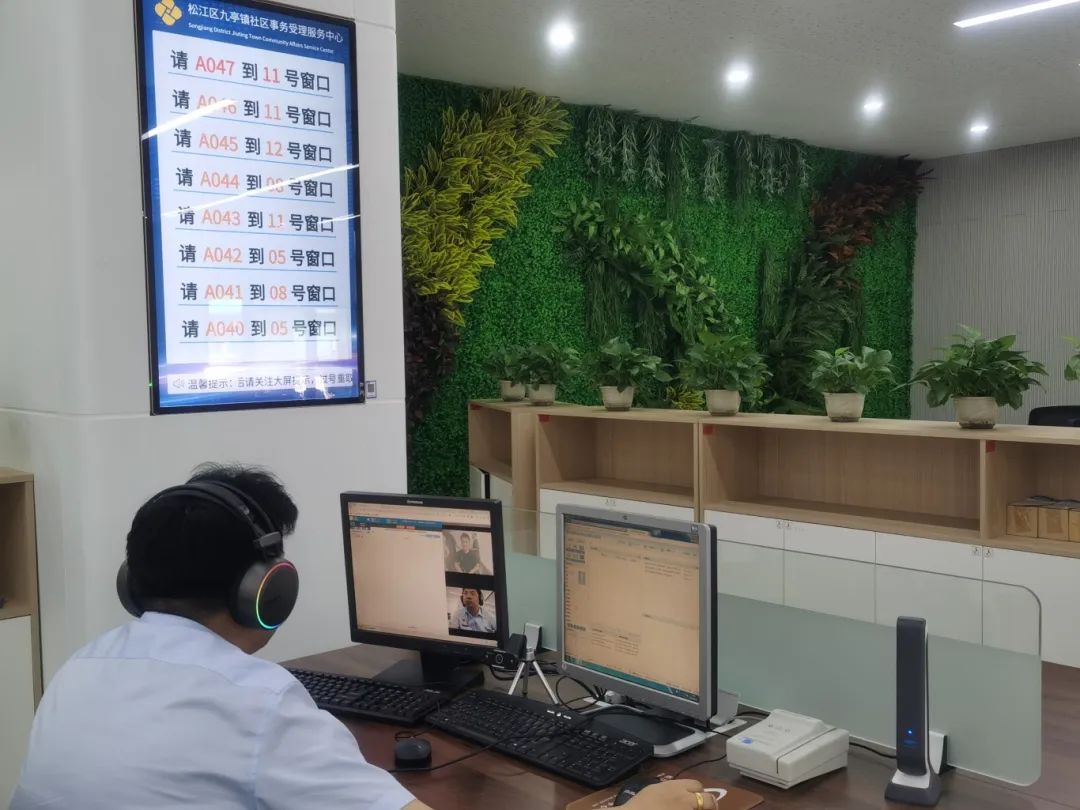 远程虚拟窗口以双屏交互的方式提供服务。一端是颐景园居委会的延伸点,另一端是九亭镇社区事务受理服务中心的服务大厅。居民可以在延伸点读取身份证、社保卡或电子亮证,工作人员可以在受理中心办公厅获取信息,打开视频对话,工作人员可以点击“远程打印收据”,居民可以在延伸点放入纸张中收到打印文档,享受与在服务大厅做事相同的感受。