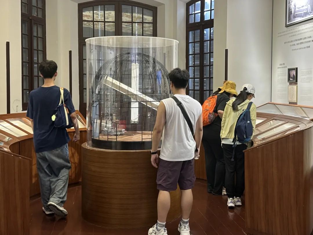 活动当天,来自世界各地的师生在志愿者尹海博的带领下,聆听百年天文台的历史,在博物馆感受天文的魅力。光是大门上方的装置“日邈”就让他们大吃一惊。据报道,这不仅是古代用太阳投射方向来衡量时间的计时仪器,也凸显了上海天文台在北京时间、星载原子钟等授时领域的背景。佘山,从外国投资者建造到自主制造,建造了中国“第一个”大型天文光学望远镜,见证了中国现代天文的发展。