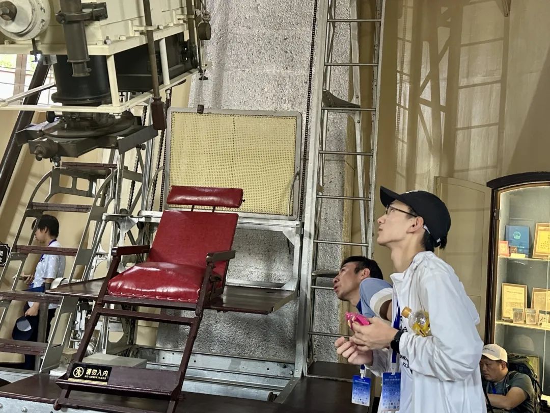 在探索天文博物馆的过程中,我们感受到了它的经久不衰。当“镇馆之宝”-40厘米双筒折射望远镜映入眼帘时,每个人的脸上都掩饰不住惊喜和喜悦。他们围着这面百年老镜,抬头看着每一个细节。自1901年以来,这款望眼镜已经拍摄了近7000张天文照片,并在1910年和1986年两次记录了哈雷彗星的回归。它精准的观察能力和巨大的历史价值引起了在场师生的热烈讨论。