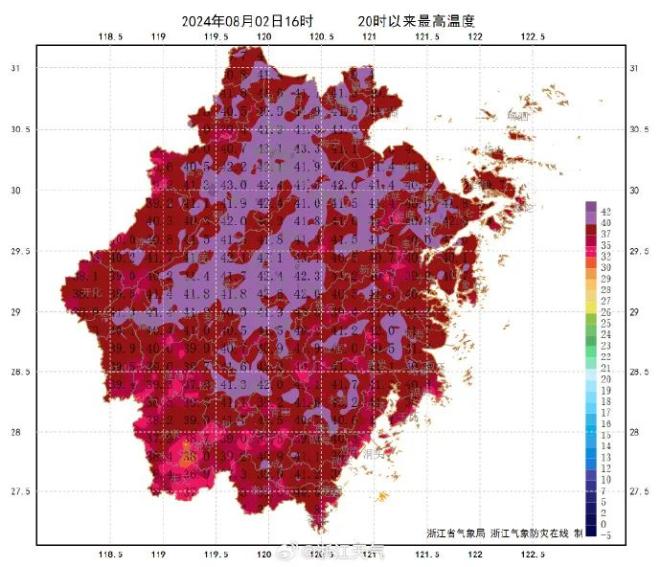 八月二日,浙江高温红色预警蓬勃发展。据浙江省气象台数据显示,截至16时,全省40℃区域数不胜数,最高诸暨41.5℃,其中普陀37.6℃和温州39.6℃破坏了8月初的最高温度记录。