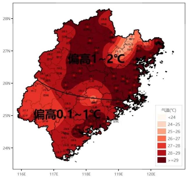 根据新华网,福建气象局的数据显示,7月份,福建全省平均气温29.5℃,较高1.4℃,是1961年至今历史同期第二高。除了云霄低0.7℃外,全省其它地区平均气温较高,10个县(市、区)城市高2℃以上,建阳高2.4℃最高。七月三日至二十四日,福建经历了一次大规模的高温过程,共有55个县(市、区)城市日最高温度。≥在福州市(19日),37℃,中北部多地出现40℃及以上的高温,月极端最高温度为40.8℃。这个过程的持续时间和范围都是1961年至今历史第三,达到了极端高温事件的标准。