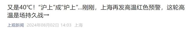 2024年8月2日12时20分,上海中心气象台将高温橙色预警信号更新为高温红色预警信号:受副热带高压影响,预计8月2日本市中心城区最高温度将达到40℃。高温橙色预警信号更新为高温红色预警信号。请特别加强对工农业生产和人体健康的不利影响,确保生产、消防和用电安全。