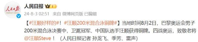 当地时间8月2日,卫冕冠军、中国队球员汪顺在巴黎奥运会男子200米混合泳决赛中获得铜牌。四战奥运会,向老将汪顺致敬!