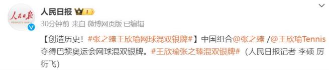 创造历史!中国组合张之臻/王欣瑜获得巴黎奥运会网球混双银牌。