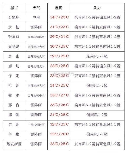 今天白天,全省多云转阴,很多地区都有渗透性雷暴或阵雨,包括张家口、承德、唐山北部、秦皇岛北部、廊坊北部、保定西部、石家庄西部的一些地区,有中到大雨,有些地方有暴雨,有短期强降水、短期强风等强对流天气,有些地方有冰雹。最高气温,张家口中北、承德北、保定西北22~在其他地区,29℃30℃~34℃。