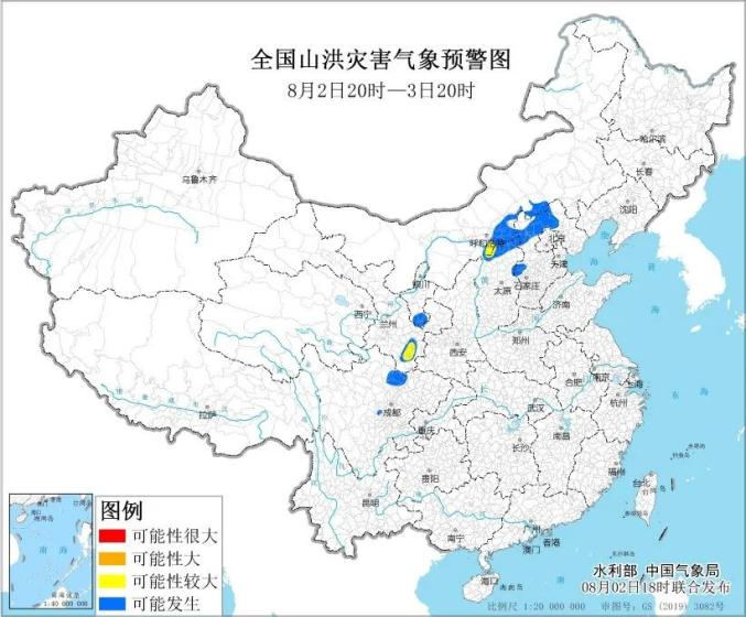 预计8月2日20:00至3日20:00,山洪(蓝色预警)可能发生在河北北部和西部、山西北部和东部、内蒙古中部、四川北部和中部、甘肃南部和宁夏南部。其中,山洪更有可能发生在山西西北部、内蒙古中南部和甘肃东南部(黄色预警)。由于局地短历时强降水,其他地区也可能造成山洪灾害,请各地做好实时监测、防洪预警、避险转移等预防工作。