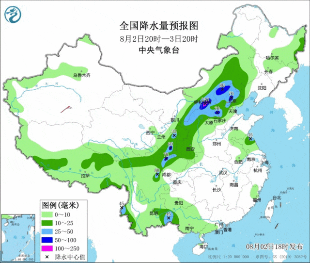 8月2日18时,中央气象台发布蓝色暴雨预警: