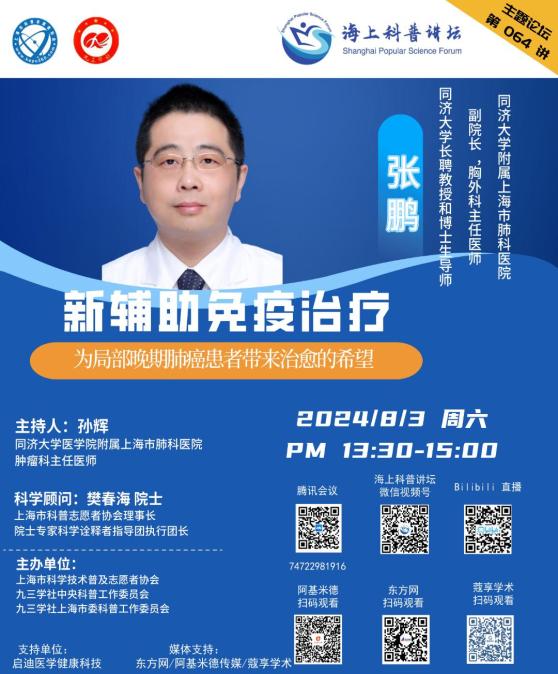 周六,同济大学附属上海市肺科医院副院长、胸外科主任医师、同济大学教授、博士生导师张鹏将带来新辅助免疫治疗专题报告,介绍新辅助免疫治疗如何给局部晚期癌症患者带来治愈的希望。