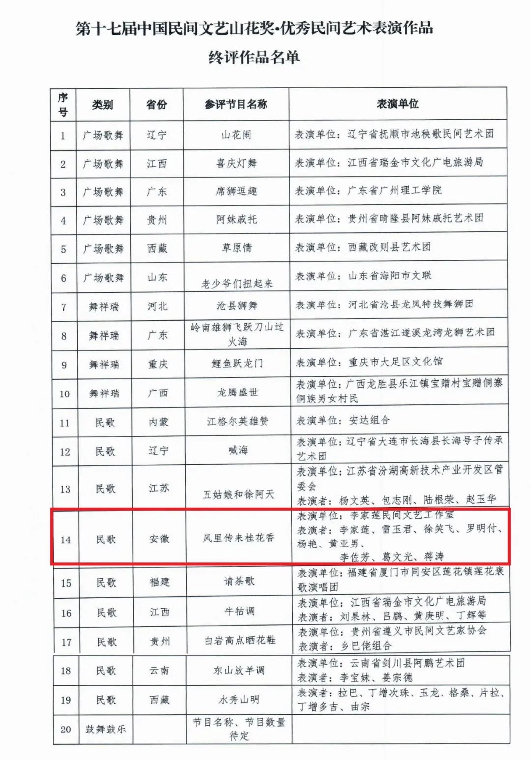 中国第十七届⺠2024年10月中上旬,江间艺术节计划在江间。⻄中国在省瑞金市举行⺠艺术节是我们的国家⺠文艺界规模最大、规格最高的文化盛典。第十七届中国将举行第十七届。⺠间文艺山花奖• 出色⺠间艺术表演作品最终评选活动。现在,经组织评委审核,共有19个节目通过了初评比较。 (其他鼓励鼓乐作品将在其它活动中选出)。 在这些节目中,合肥参评节目《风中传来桂花香》当选。