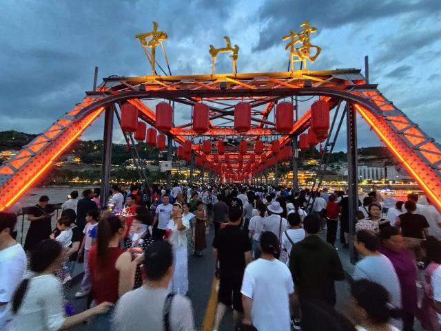 江西游客吴涛站在桥上,边走边和家人视频。他说第一次去西北,兰州是第一站,中山桥是他的第一个景点。站在百年铁桥上,吹着河风,每一块铁石,每一根横梁,似乎都在诉说着过去的故事,让人陶醉其中。他刚刚向家人介绍了“兰州夜景”,下次带他们去兰州看美景,吃美食。