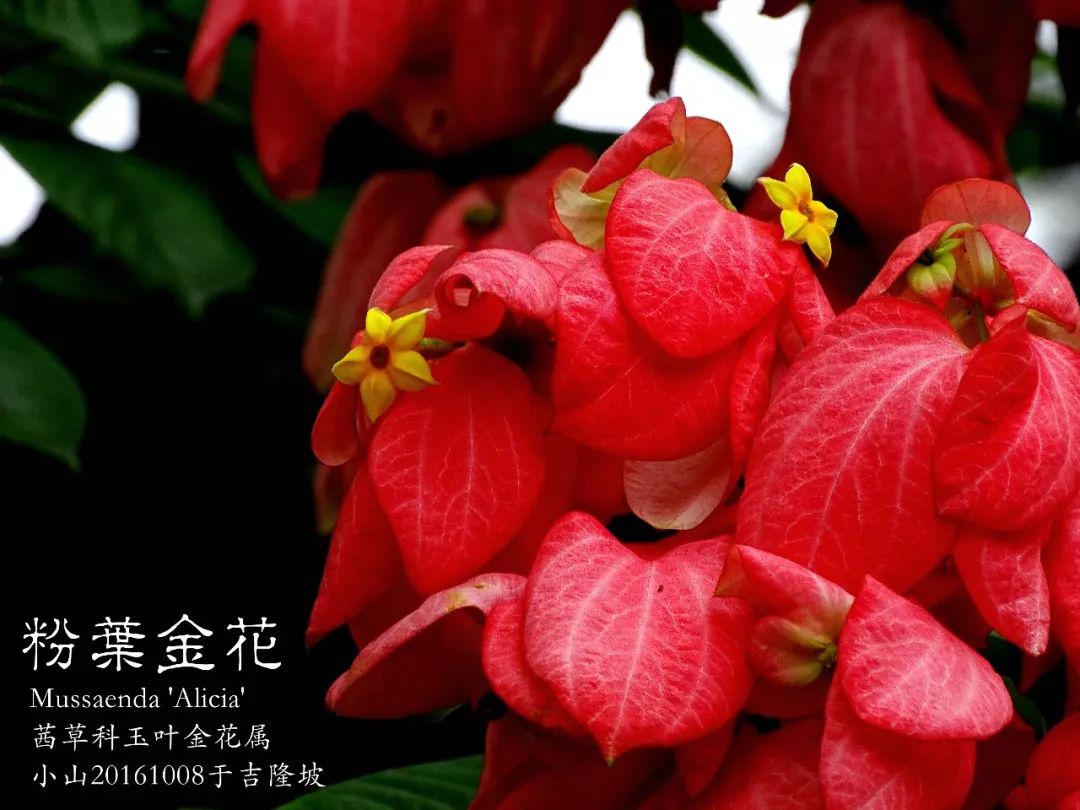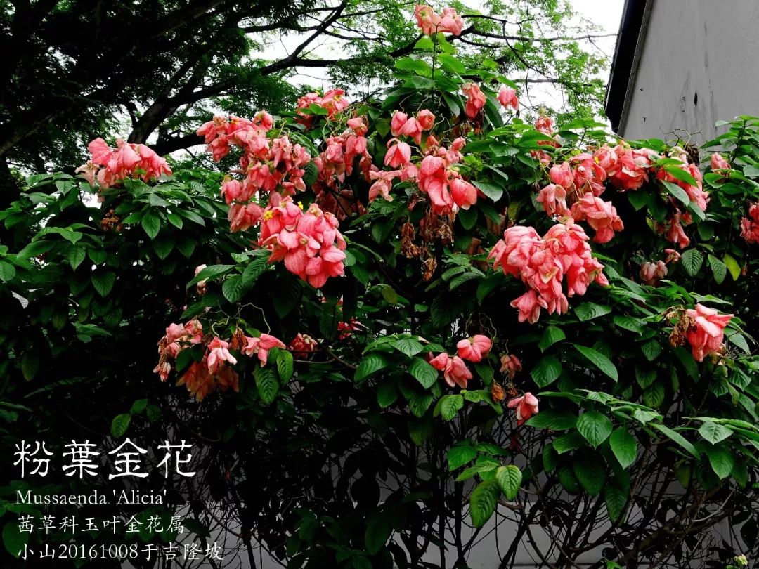 其实还有另外一种绿化植物,叫粉叶金花,也叫粉纸扇。它们的花是黄色的,仍然没有那么显眼,但它们的特化花萼不同于大叶白纸扇,不是一个,而是五个都是特化的,颜色还是粉色的。远处只能看到绿叶之间一堆粉色的“花瓣”,重叠,明亮异常。