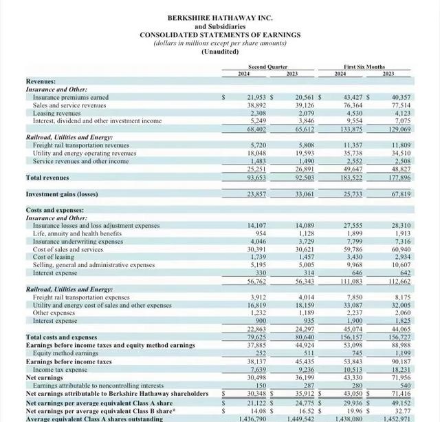 “股神”巴菲特旗下伯克希尔-哈撒韦公司于北京时间8月3日晚公布了2024年第二季度财务报表。