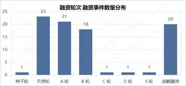 从融资轮的分布来看,本周天使轮是最活跃的,融资事件数量达到 23 从上周开始,比上周有所增强 2 起步,占比达到 26.74%;A 轮子排在第二位,为 21 从上周开始,比上周减少了 5 起,占比 24.42%;战略性融资排名第三, 20 起。就融资金额而言,本周 B 轮子受极大值影响比例最高,达到 其次是战略融资,融资金额占43.93%。 36.24%。A 第三轮排名,融资金额占比。 11.79%。总体而言,本周融资轮次分布较上周有所后移。