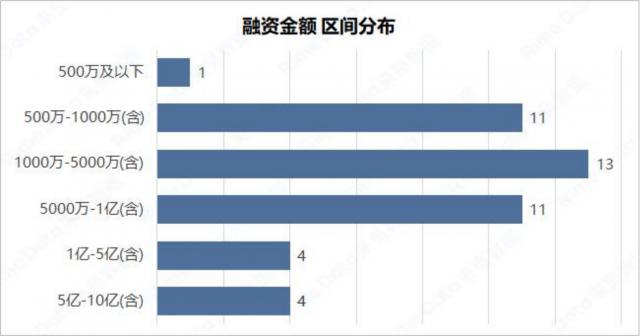 本周已经披露了金额的融资事件。 44 从上周开始,增加了 4 起。与上周相比,融资金额的分布结构发生了很大变化,本周 500 一万以下的融资事件只有 1 从上周开始,比上周减少了 2 起;500 万 -1000 万(含 1000 万)融资事件总数 11 从上周开始,比上周减少了 4 起;1000 万 -5000 万(含 5000 万)融资事件为 13 起,较上周增加 7 起;5000 万 -1 亿(含 1 十亿美元)融资事件 11 从上周开始,比上周有所增强 3 起;1-5 亿(含 5 亿)融资事件为 4 从上周开始,比上周减少了 1 起;这周 5-10 亿(含 10 十亿美元)融资事件 4 从上周开始,加强 3 另外,这个星期没有 10 融资事件超过1亿,上周有融资事件 2 起。