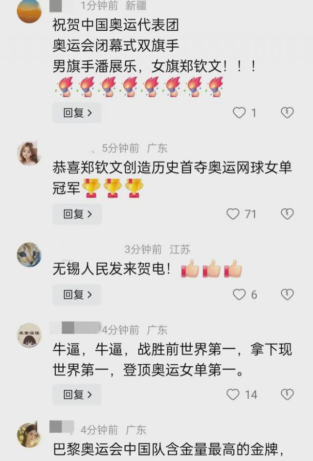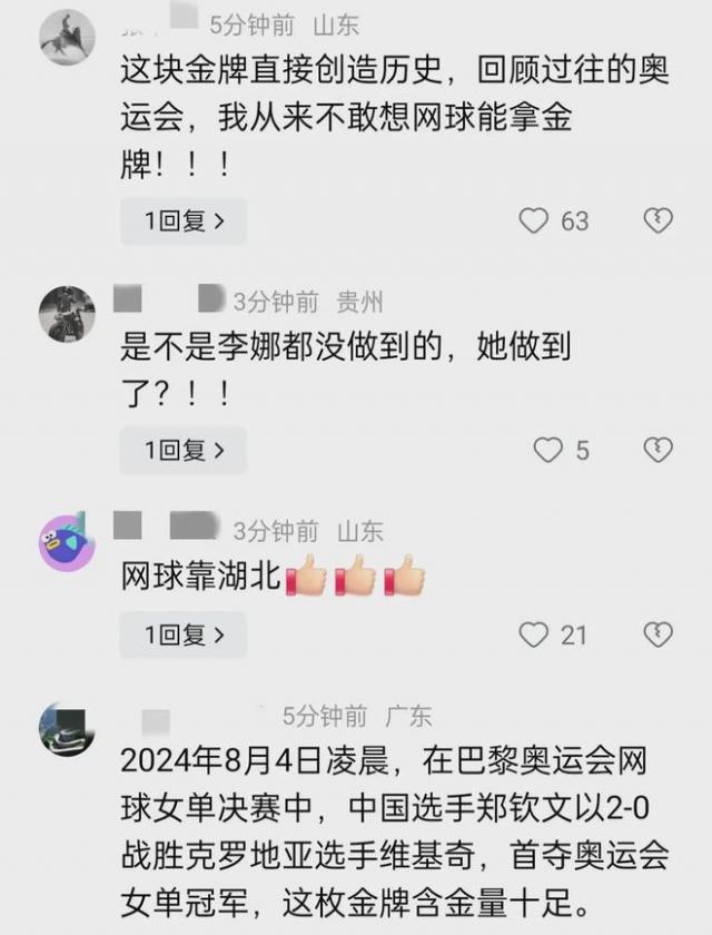 获得奥运网球女单冠军的郑钦文创历史!郑钦文第16金,评论区炸锅!