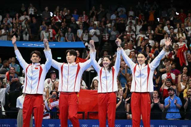 北京时间 8 月 4 日凌晨,2024 男女巴黎奥运会游泳比赛 4X100 大米混合泳接力决赛拉响,中国队 3 分 37 秒 55 打破亚洲纪录获得银牌。美国队打破世界纪录获得金牌,澳大利亚打破大洋洲纪录获得铜牌。