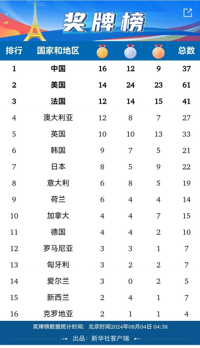 北京时间 8 月 4 一天早上,在巴黎奥运会网球女单决赛中,郑钦文直接输掉了两场比赛。 6-2、6-3 克罗地亚球员维基奇获得冠军,为中国网球在这个项目上取得了历史性的突破。同时,中国代表团还获得了巴黎奥运会第一名 16 金!