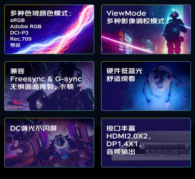 支持显示屏 ViewMode 方式,包含 FPS、RTS 和 MOBA 三种游戏,标准,电影,网页浏览,文字,MAC 以及医学灰阶等应用场景模式,IT 以下是世家附产品的亮点和参数: