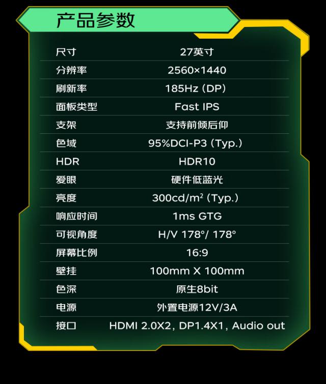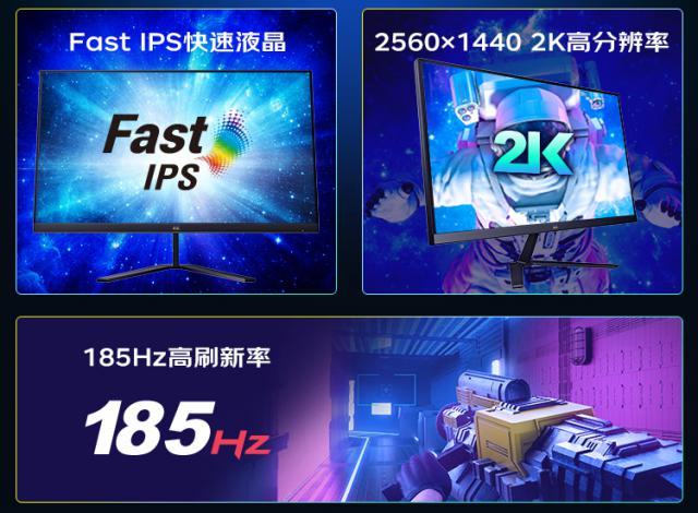 优派 VX2756-2K-PRO 显示屏的宽度为 27 英尺,搭载 Fast IPS 面板,可视范围 178 °,支持 185Hz 高刷,GTG 响应速度 1ms。