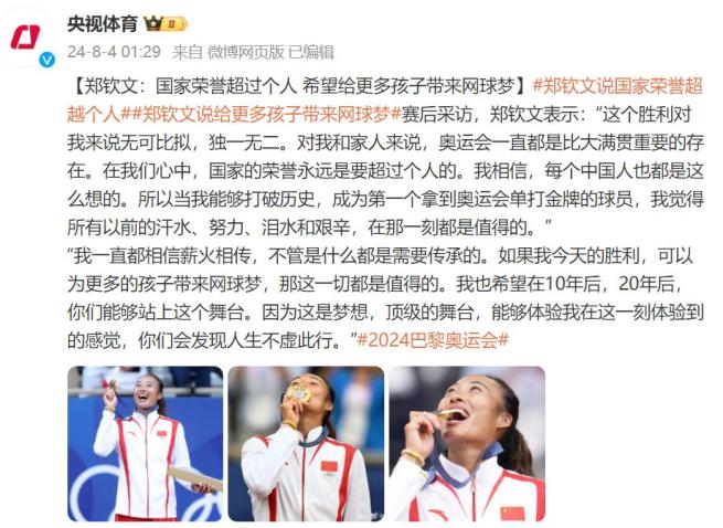 比赛结束后,郑钦文说:“这场胜利是我无法比拟的,是独一无二的。对于我和家人来说,奥运会一直比全满贯更重要。我们的心目中,我们国家的荣誉总是超过个人。每一个中国人都会这么想,我相信。因此,当我能够打破历史,成为第一个在奥运会上单挑金牌的球员时,我认为在那一刻,所有之前的汗水、努力、泪水和艰辛都是值得的。”