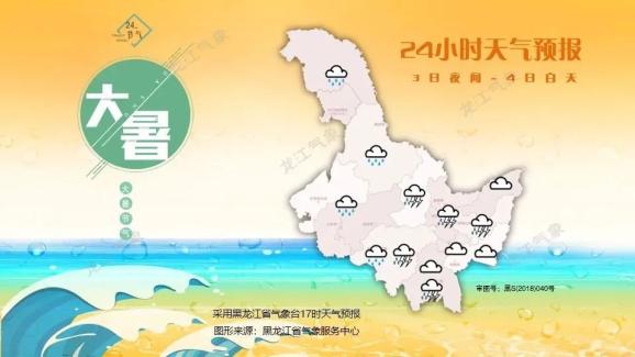 3日晚至4日白天:大兴安岭、黑河、齐齐哈尔、绥化、大庆、哈尔滨西部阴天,局部暴雨,佳木斯东部、七台河、鸡西、牡丹江南部阴天,其他地区阴天有阵雨或雷暴。