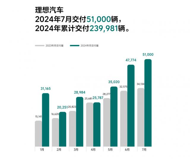 据数据显示,截至 2024 年 6 月 30 日,理想汽车累计交付量达到 822,345 汽车,位居中国新力量品牌总交付量第一。但是在 8 月 1 日本,理想汽车公布 7 每月交付数据,创月交付量历史新高,交付数据 51,000 辆。